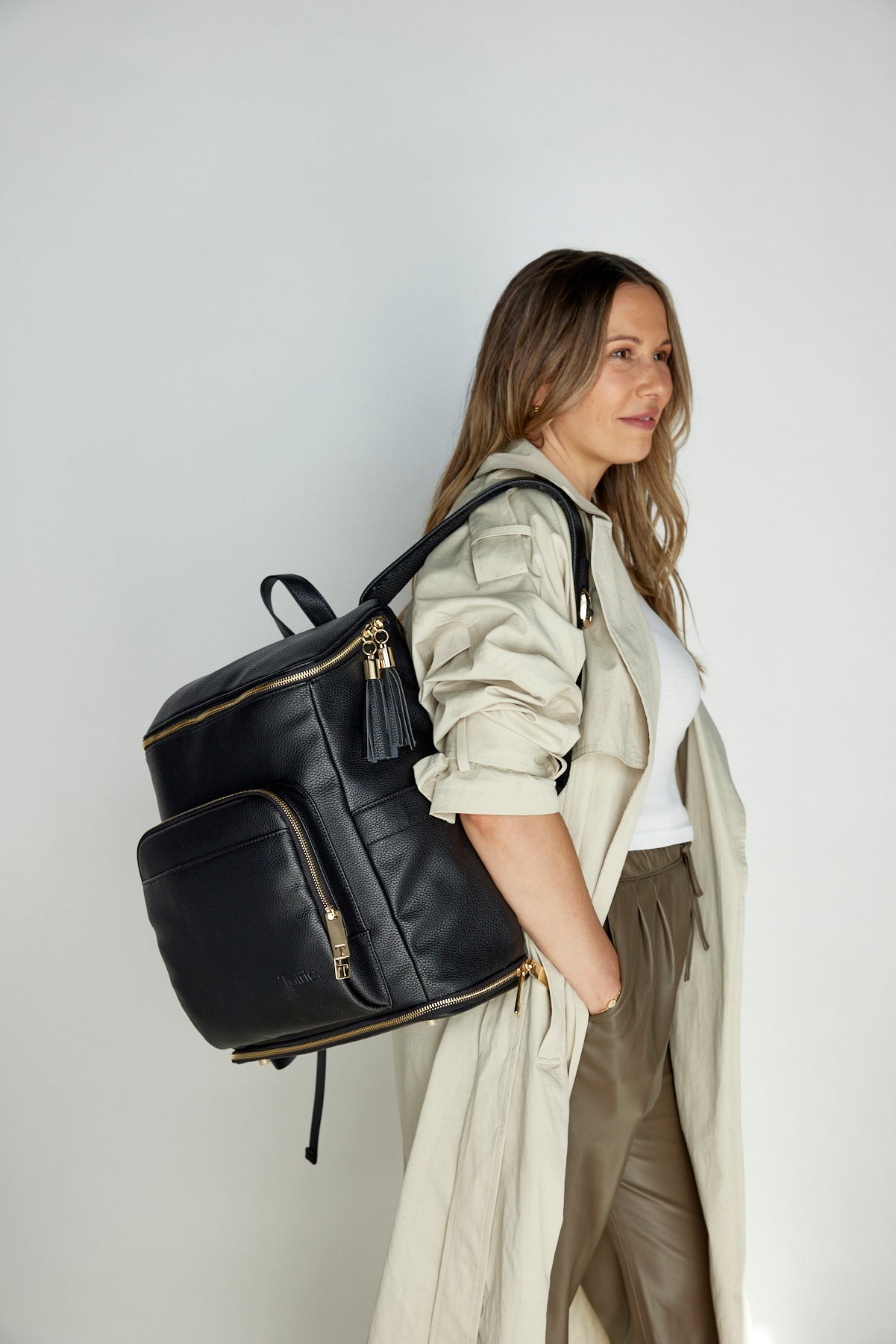 Minimalist in black with a luxe vibe, her clever design with the practicality every parent wants, but doesn't know exists, make her irresistible. She’s a premium vegan leather black baby bag backpack (say that five times fast!), but she’s essential to parents on the go. Designed by parents, for parents who don't want to sacrifice style for practicality and efficiency.