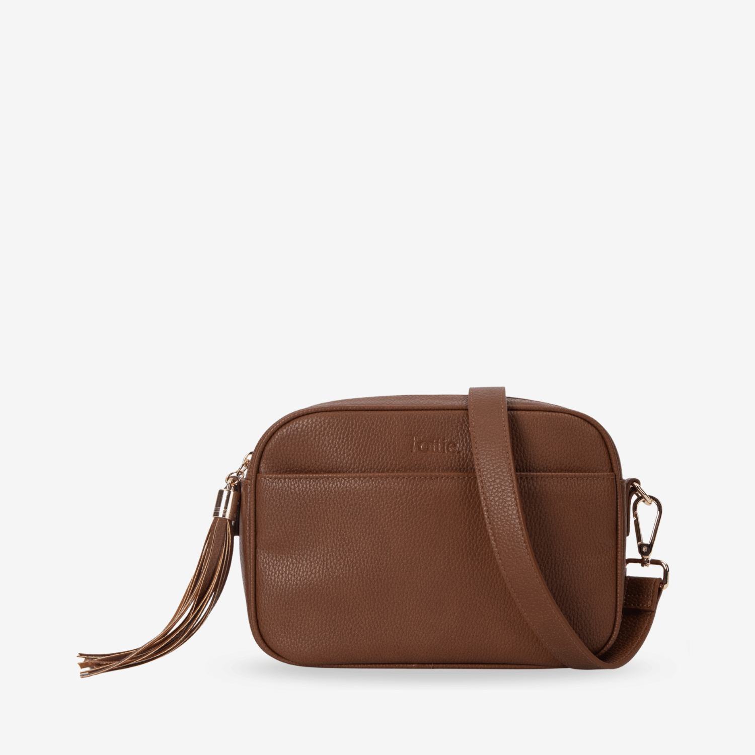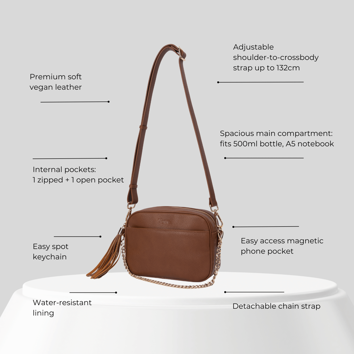Our tan crossbody bags are huge! We call this the Mary Poppins bag for a reason. You can fit everything you need for all day on the go activities. Larger than the average crossbody, organisation meets all day style. The crossbody bag for women in tan with gold hardware is large enough for more than just the essentials with all the pockets and space you need to keep your you-know-what, together.