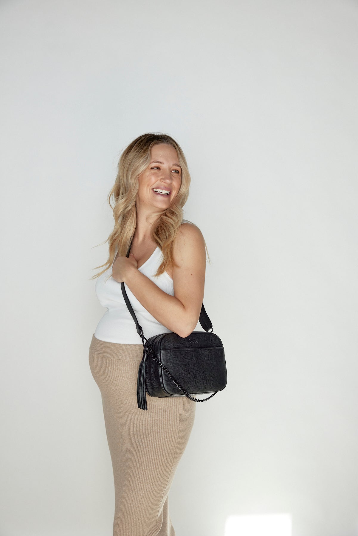 Minimalist in black with a luxe vibe, her clever design with the practicality every woman wants, but doesn't know exists, make her irresistible. She’s a premium vegan leather black cross body bag, but she’s essential to anyone on the go. Designed by women, for women who don't want to sacrifice style for practicality and efficiency.